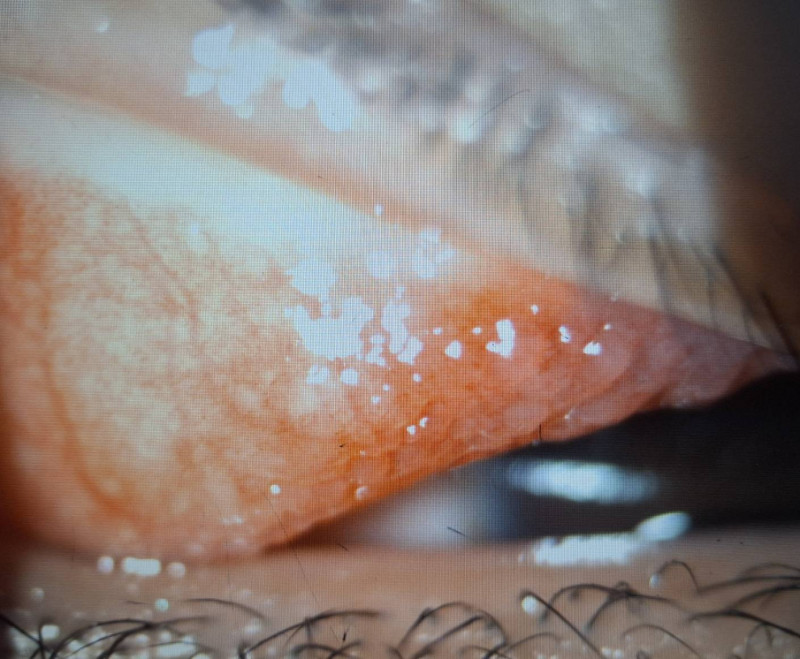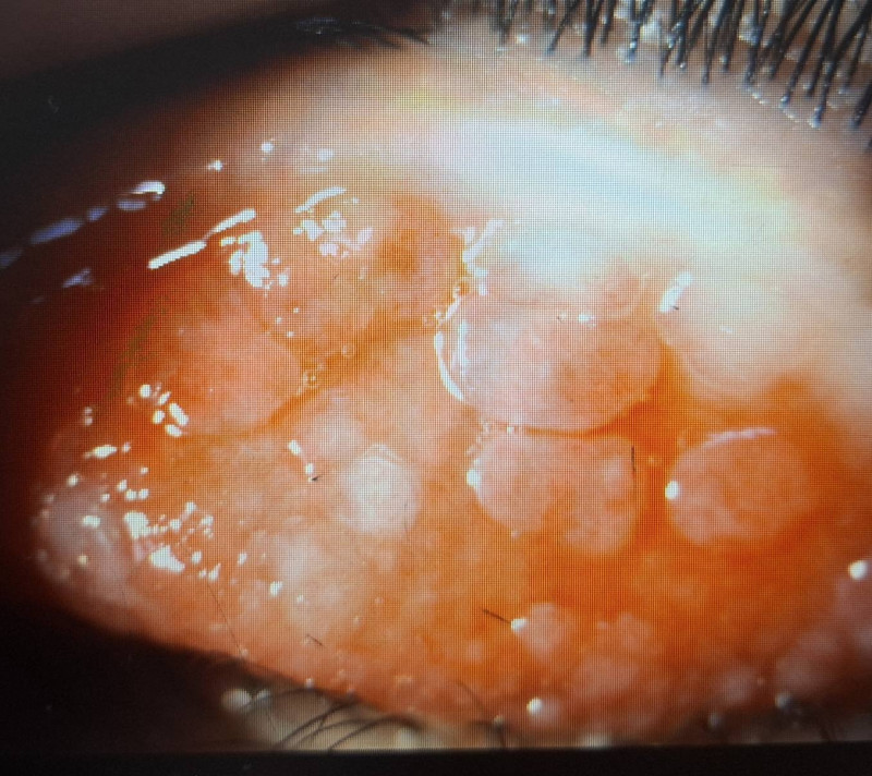 男童因結膜慢性發炎,使結膜上皮細胞的過度增生,長成大於0.1公分的乳突。(洪啟庭提供)