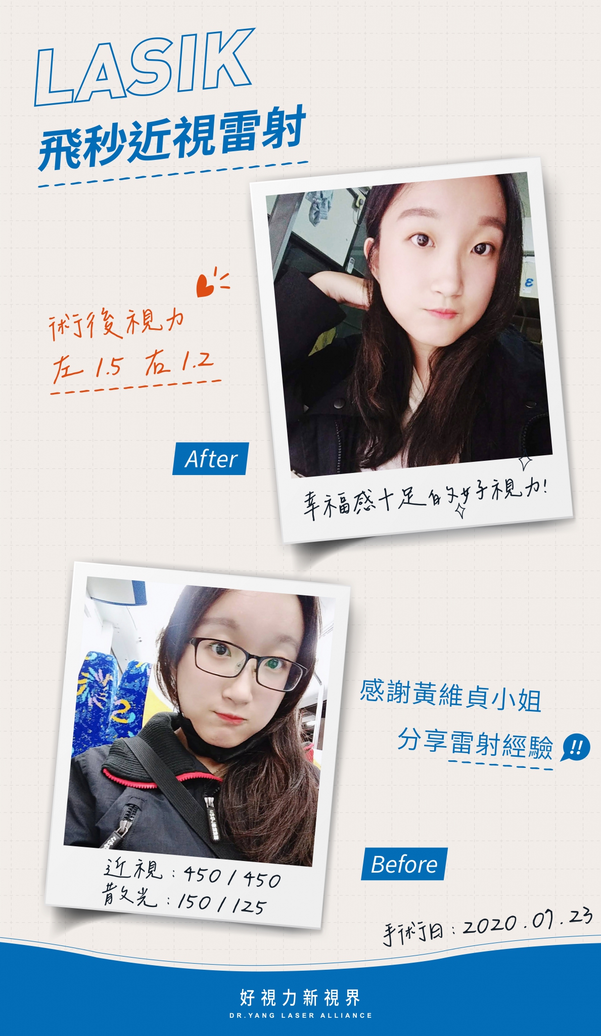 手術完,一開始左眼有點不太舒服,於是專員很有耐心的幫我點淚液,讓我眼睛不會不舒服,隔天睡覺醒來一張開眼,發現視野變的清晰但還有點糊糊的,經過兩個禮拜的時間,視野漸漸變的清晰模糊的感覺消失,真的很開心 謝謝楊醫師讓我恢復視力,讓我眼睛變的更好